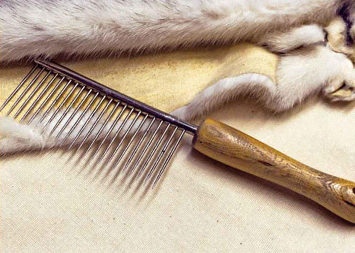 Расчёска-чесок и щётка для меха нужны, чтобы расчёсывать и укладывать ворс; они особенно удобны, когда нужно скрыть шов или место починки. Купить их можно в любом зоомагазине.