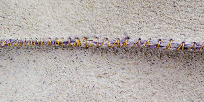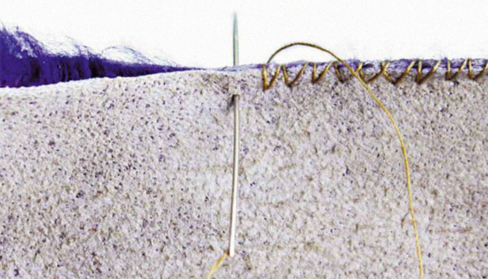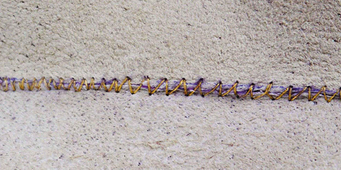 По сути, это обмёточный шов, через край, но его особенность состоит в том, что иглу вводят в один прокол дважды. Стежки располагаются под углом друг к другу в форме буквы «V».