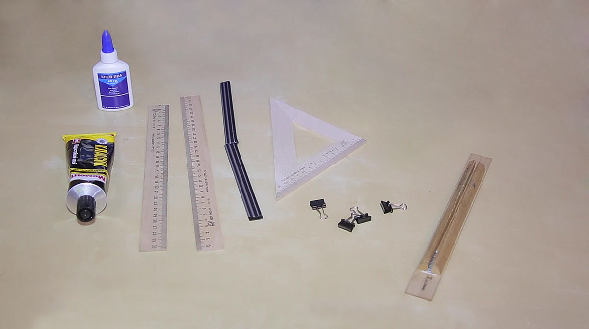 Скрепкошину можно заменить двумя деревянными брусочками, которые приклеиваются к линейке на достаточном друг от друга расстоянии, чтобы треугольник легко двигался, но не выпадал. Это расстояние равно толщине треугольника + 1 мм.