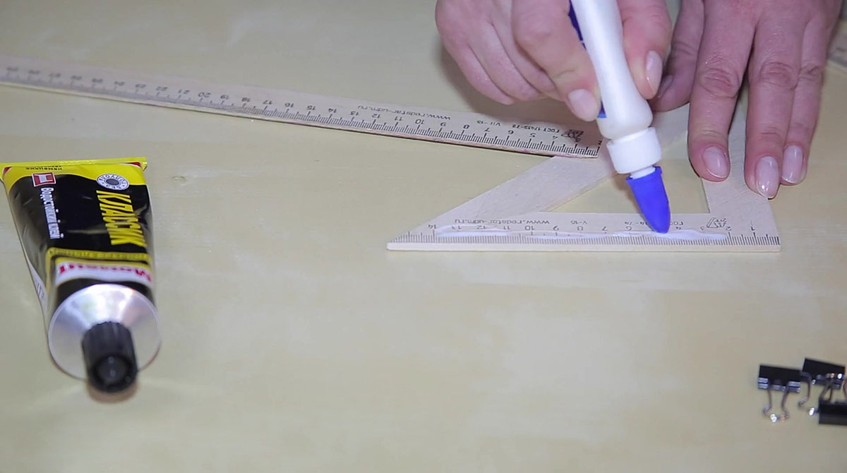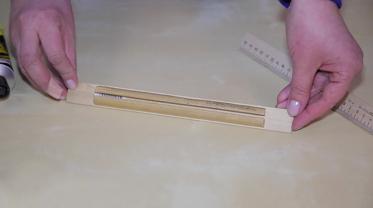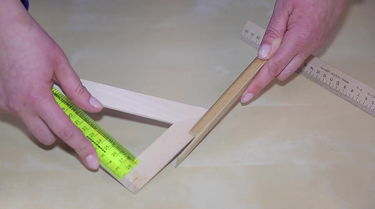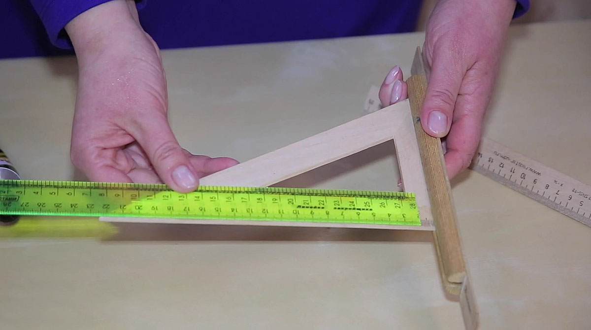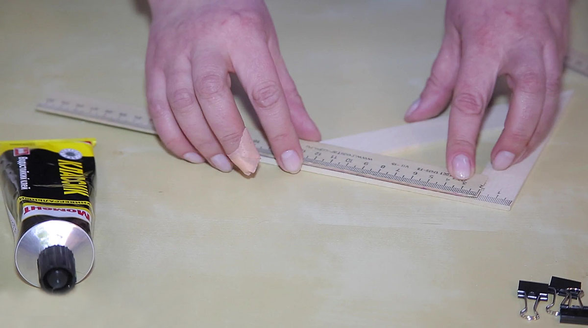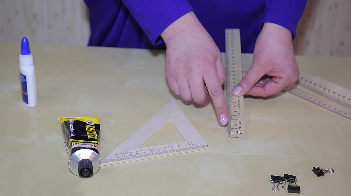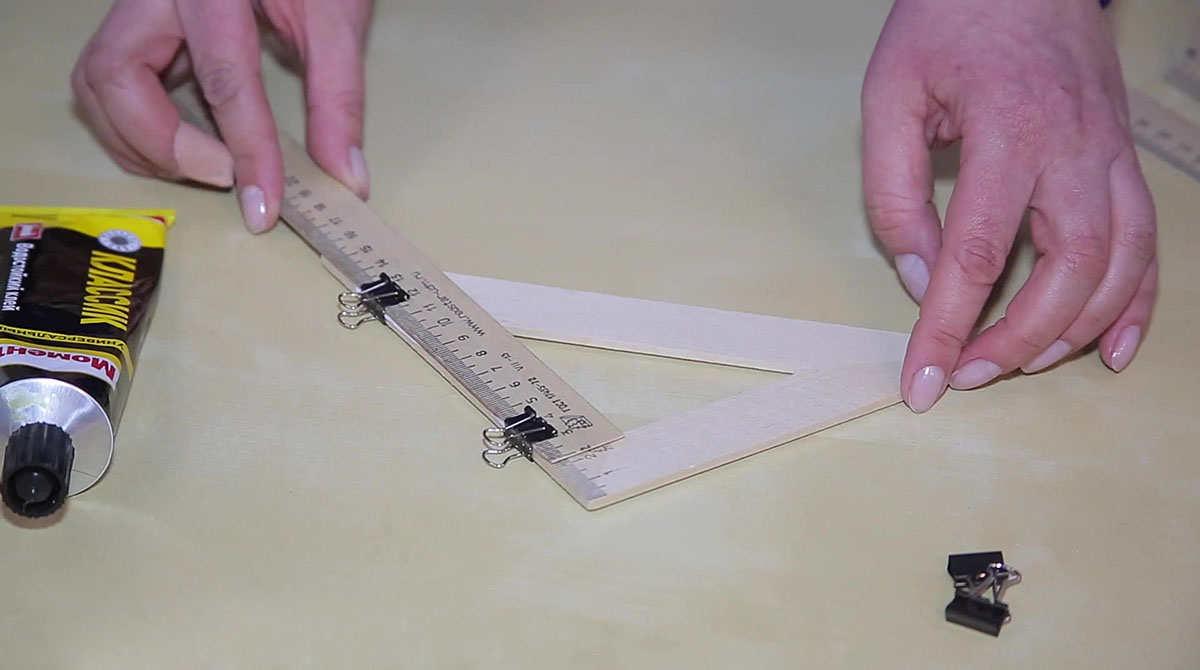 Начало деревянной линейки длиной 30 см нужно спилить до отметки 2 сантиметра. Так как линейки изготавливаются из мягкого дерева, сделать это можно кухонным ножом-пилкой. Эту деревянную линейку приклеиваем клеем ПВА на треугольник, совместив деления 2 см. Склеенные детали скрепляем зажимами и оставляем сохнуть.