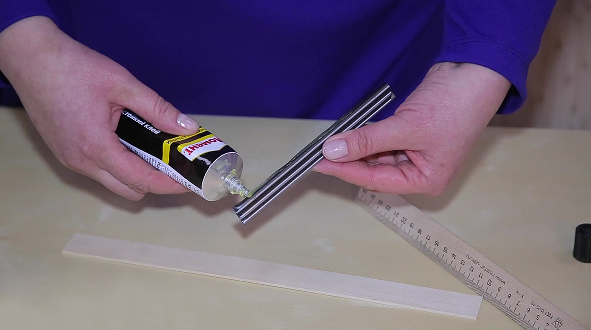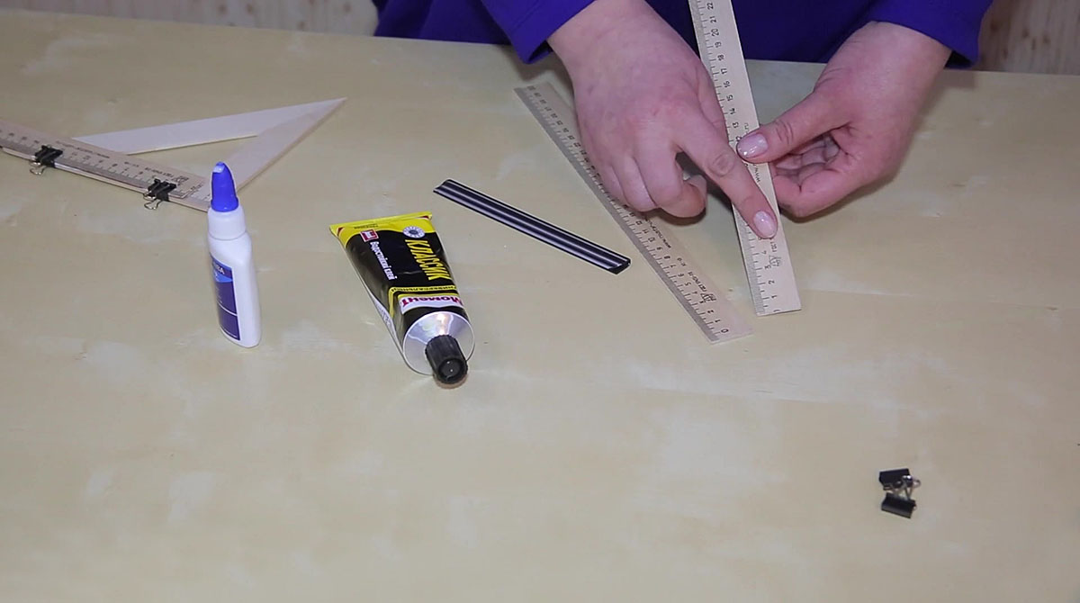 Линейку длиной 25 см нужно спилить до отметки ноль. От скрепкошины отрезаем кусок длиной 15-17 см и приклеиваем посередине тыльной стороны этой линейки (и по длине, и по ширине) на клей Момент. Оставляем сохнуть на пару часов.